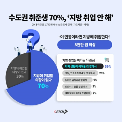 최근 AI 매칭 채용콘텐츠 플랫폼 ‘캐치’가 수도권 주요 대학 출신의 20대 구직자 1,743명을 대상으로 진행한 '지방 취업 선호도' 조사에서 눈길을 끄는 결과가 나왔다. 조사결과, 수도권 대학 출신 구직자의 70%는 지방 취업을 기피하는 것으로 드러났다. 반면, 30%만이 지방 취업에 긍정적인 응답을 보였다.