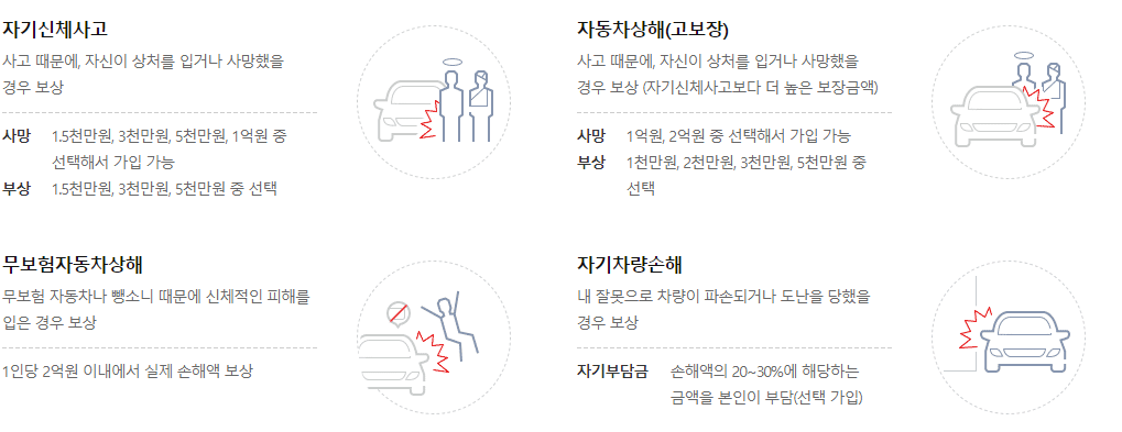 AXA 다이렉트 자동차보험의 보장 내용을 살펴봅시다. 대인배상1, 대인배상2, 대물배상 등으로 타인의 피해를 보상하고, 자기신체사고, 자동차상해, 무보험자동차상해, 자기차량 손해 등으로 자신이 입은 피해를 보상합니다.