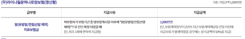 이 보험은 주계약으로 유방암 및 전립선암을 제외한 암 진단 시 치료보험금을 최대 1,000만원까지 지급합니다.