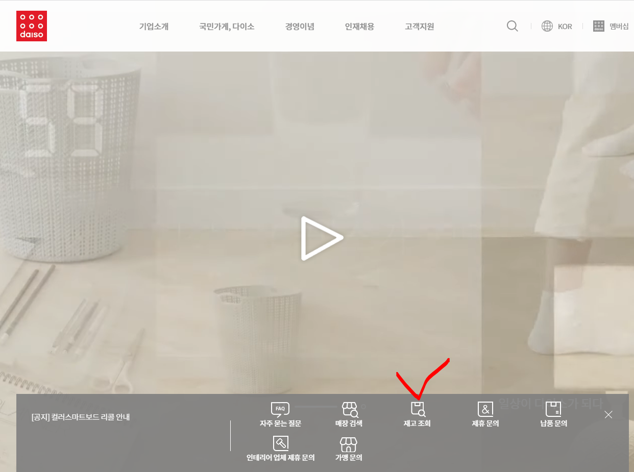 1. 다이소 홈페이지에 들어갑니다, 재고조회를 누릅니다.