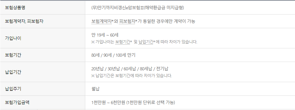 가입조건은 다음과 같습니다: 가입나이는 19세 이상부터 60세 이하이며, 보험기간은 80세, 90세, 100세 중 선택이 가능합니다. 납입기간은 20년, 30년, 60세, 80세, 전기납 중 선택이 가능하며, 납입주기는 월납입니다. 보험가입금액은 1천만원부터 6천만원까지 선택 가능합니다.