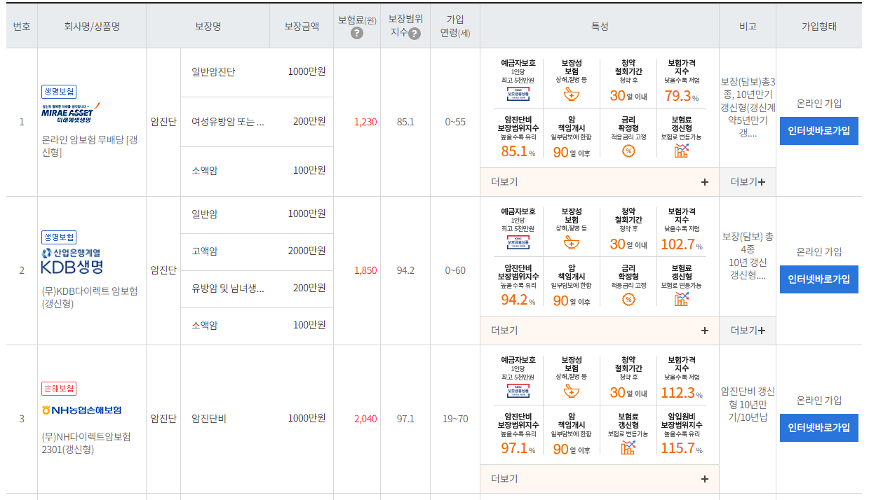 저는 일단 갱신형과 비갱신형 두 가지 모두를 선택하여 비교를 해 보았는데요, 그 결과 KDB생명, NH농협손해보험, 미래에셋 손해보험의 갱신형 암보험 상품이 가장 저렴하게 나왔습니다.