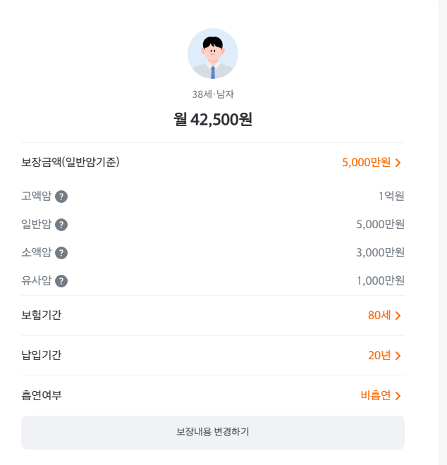 이 상품에 가입할 때 고려해야할 몇 가지 사항들이 있습니다. 예를 들어, 38세 남성 가입자의 경우, 보장을 받는 나이를 60세까지로 설정하여 주계약을 5천만원, 납입 기간을 20년으로 설정하였습니다. 그러나 암 위험이 증가하는 연령은 대체로 50대 중후반이며, 이는 80세까지 이어집니다. 이러한 시기를 준비하기 위해 젊어서 낮은 가격으로 비갱신형 암보험에 가입하는 것이 중요합니다. 그런데 보장 기간이 60세에서 끝나는 것은 비효율적일 수 있으므로, 이 점은 반드시 고려해야합니다. 보험료는 42,500원이 나왔네요