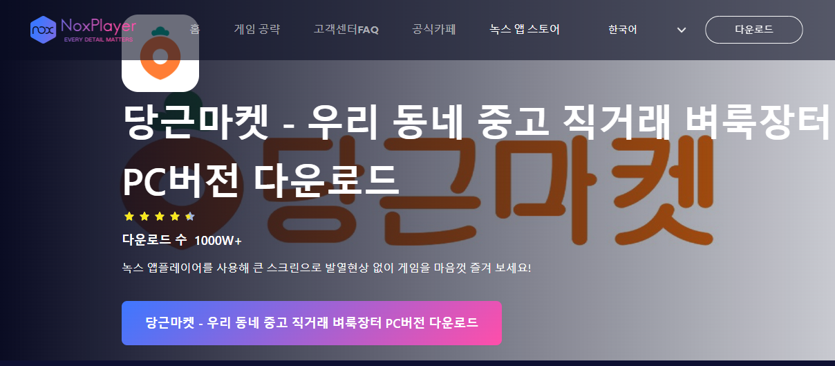 녹스 앱플레이어는 블루스택과 함께 가장 널리 사용되는 안드로이드 에뮬레이터 중 하나입니다. 먼저, 녹스 공식 웹사이트에서 설치 파일을 다운로드합니다. 다운로드가 완료되면 설치 파일을 실행하고 지시에 따라 설치를 완료합니다. 설치가 완료되면 녹스를 실행하고, 구글 계정으로 로그인합니다. 이후, 구글 플레이 스토어에서 당근마켓을 검색하여 설치합니다. 설치가 완료되면 녹스 내에서 당근마켓을 실행할 수 있습니다.