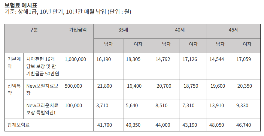 30대 남성 기준으로 보험료가 월 41,700원인데 이에 대해 고급형 상품을 선택하면 크라운치료(보철), 브릿지, 임플란트 등의 주요 항목이 보장됩니다. 보험료를 더 자세히 알아보시려면 아래 확인 부탁드립니다.