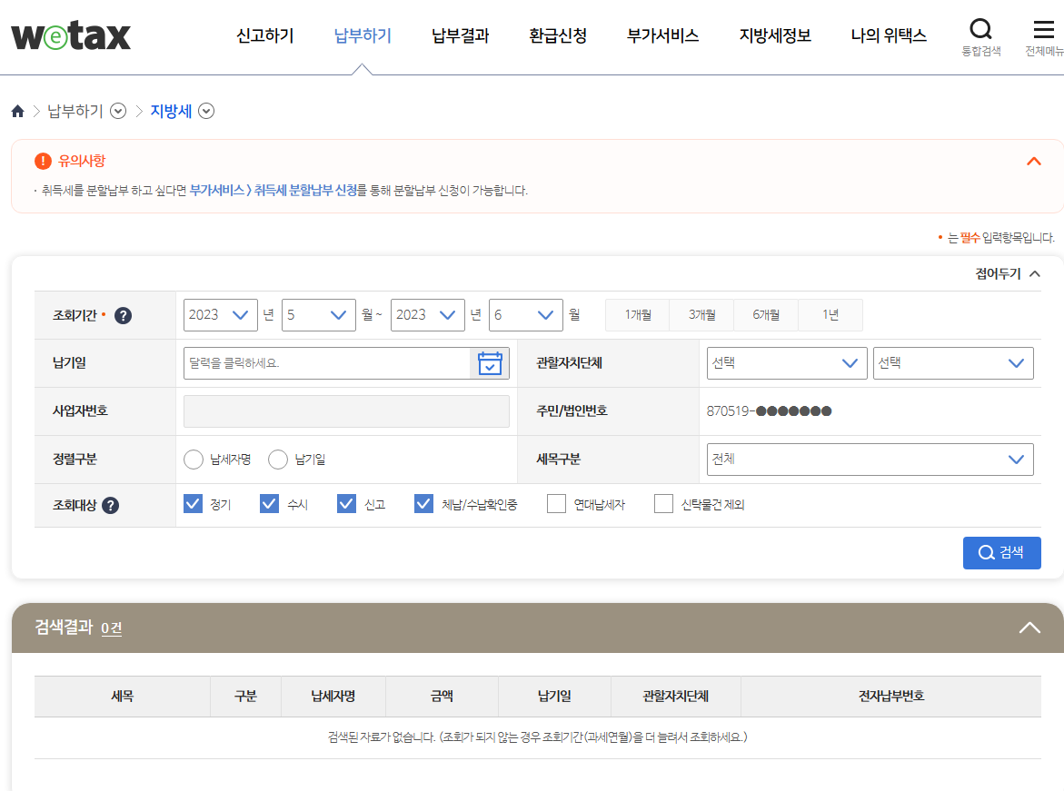 로그인을 마치고, 조회 기간 등을 설정하여 아직 납부하지 않은 지방세가 있는지 확인해보세요. 자동차세 납부가 필요하다면, 납부해야 하는 항목 옆의 체크박스를 선택한 후 우측 하단에 위치한 '납부' 버튼을 누르면 됩니다.