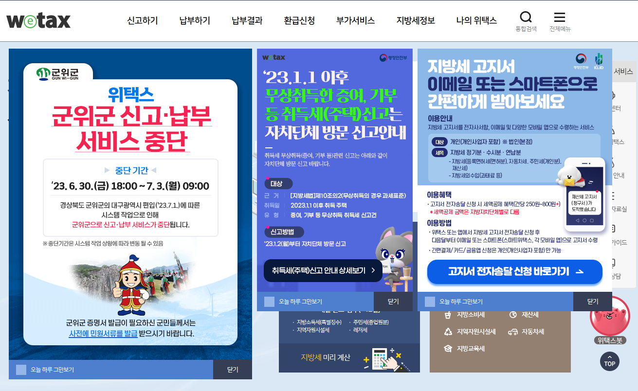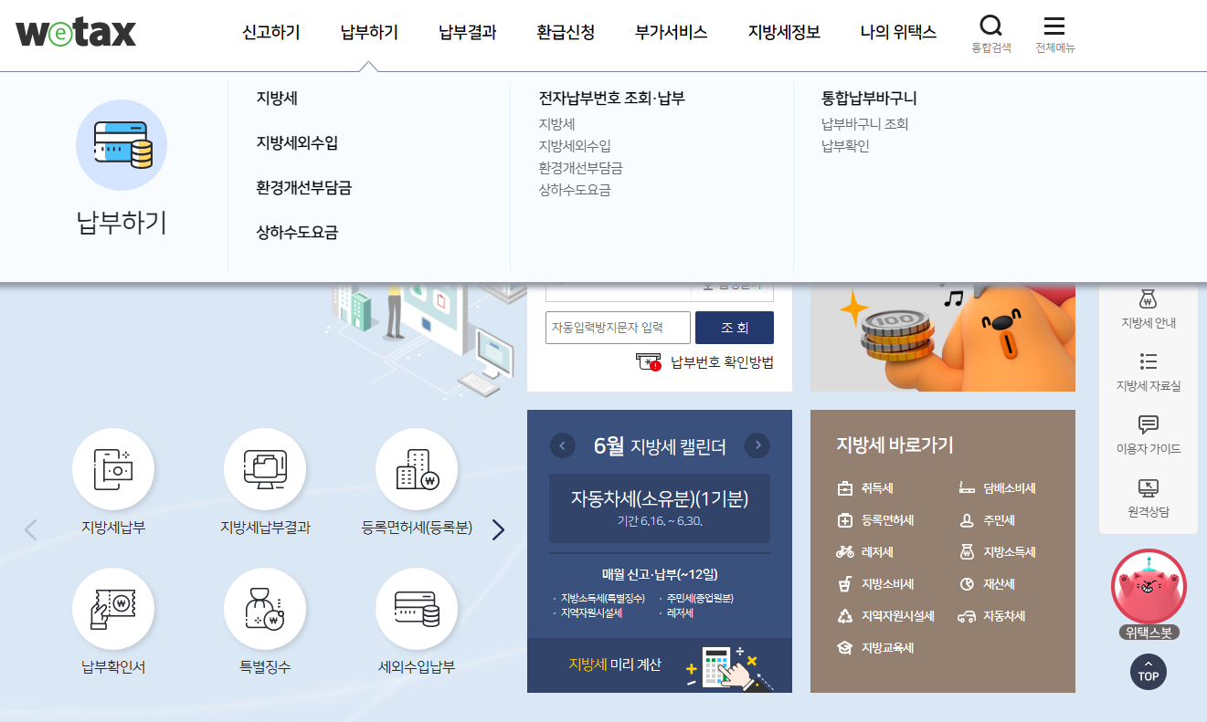 위택스 홈페이지에 들어가 보면 상단에 '납부하기' - '지방세' 메뉴를 볼 수 있는데요, 그 메뉴를 클릭하세요. 로그인을 요구할 경우 네이버, 카카오, PASS 앱 등의 간편 인증을 사용하여 로그인하시면 됩니다.