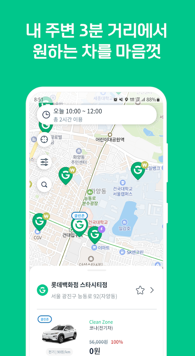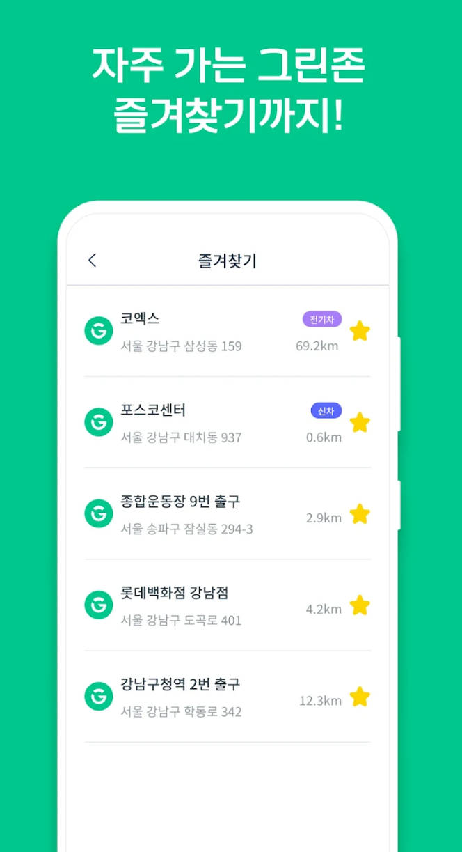 그린카 앱은 다양한 차량 옵션을 제공합니다. 소형차부터 대형차, 전기차까지 선택할 수 있습니다. 편리한 검색 기능을 통해 가까운 위치에서 차량을 찾을 수 있으며, 실시간 예약과 결제도 가능합니다.