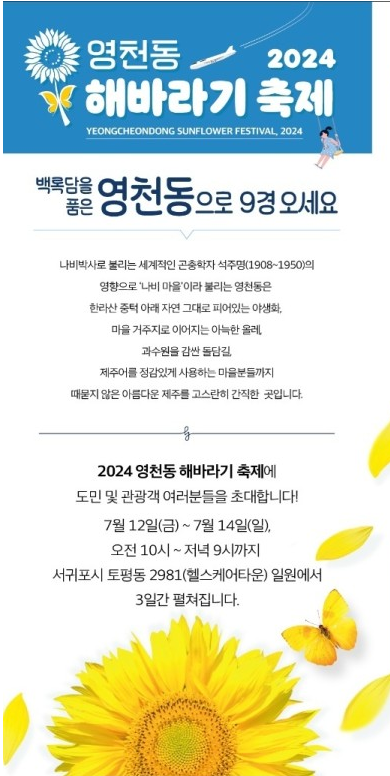 | 영천동 해바라기 축제 | 2024.07.12 ~ 2024.07.14 | 제주특별자치도 서귀포시 토평동 2981 |