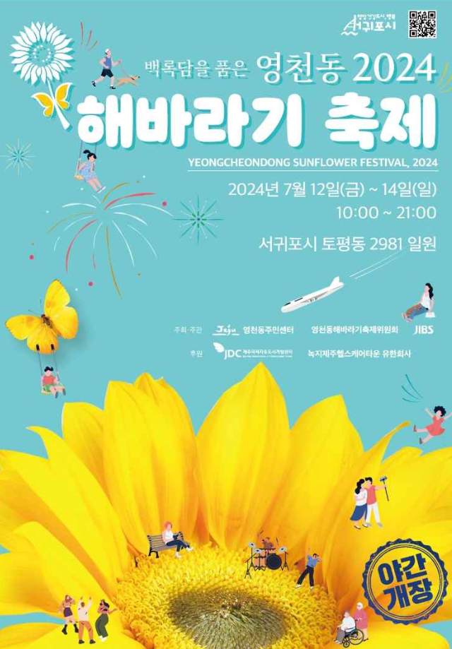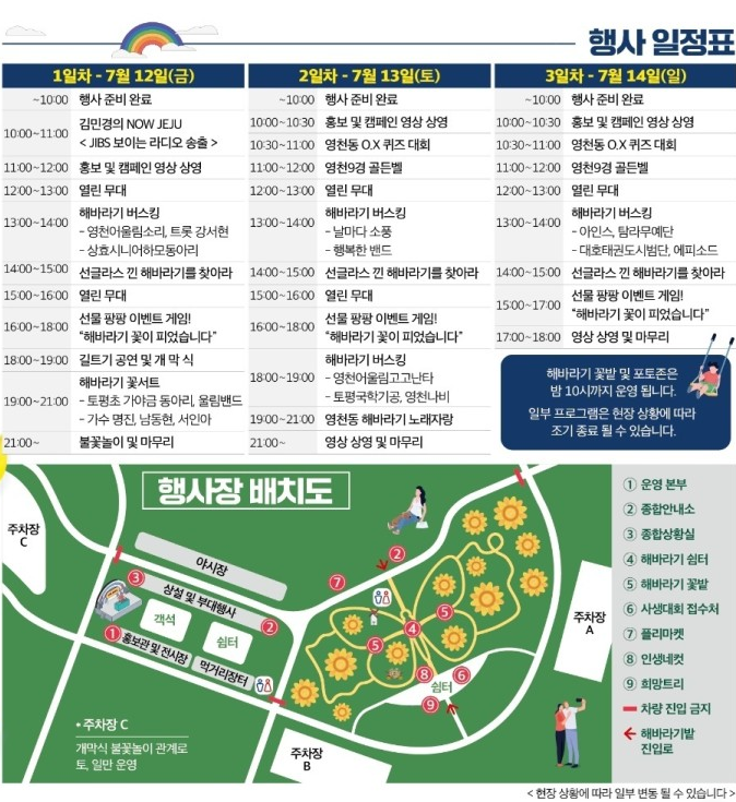 이번 영천동 해바라기 축제는 2024년 7월 12일부터 14일까지 오전 10시부터 밤 9시까지 진행됩니다. 서귀포시 토평동 2981 헬스케어타운 일원에서 펼쳐지는 축제는 다양한 프로그램으로 가득합니다.