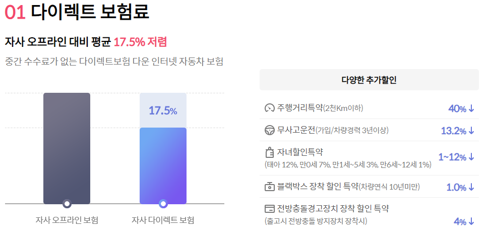 흥국화재 다이렉트 자동차보험의 가장 큰 장점은, 보험료가 오프라인 가입보다 낮다는 점입니다. 설계사 중간마진이 발생하지 않아 오프라인 대비 평균 17.5%의 보험료를 절약할 수 있습니다. 또한, 인터넷을 통해 직접 가입하면 원하는 보장을 쉽게 수정하고, 계약 내용을 관리할 수 있어 편리합니다. 서비스 품질은 흥국화재 오프라인 자동차보험과 동일하여, 안심하고 이용하실 수 있습니다.