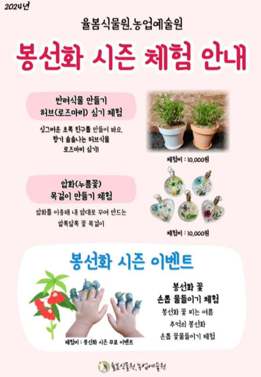 봉선화 시즌 동안 율봄식물원에서는 다양한 체험 프로그램이 운영됩니다. 봉선화 손톱 꽃물들이기 체험은 특히 인기가 있으며, 봉선화 꽃을 사용해 손톱에 천연 염색을 해볼 수 있는 특별한 기회입니다. 또한, 로즈마리 식물 심기와 향기압화목걸이 만들기 같은 체험 프로그램도 준비되어 있어, 자연을 체험하고 느낄 수 있는 다채로운 경험을 제공합니다.