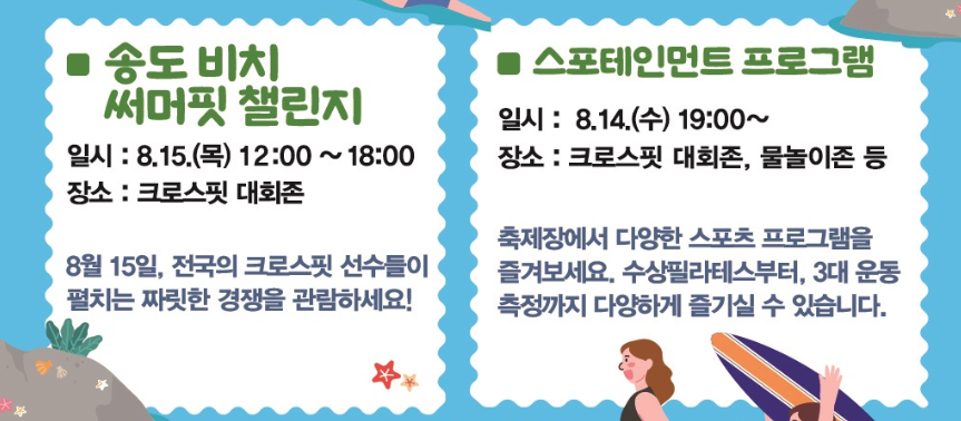 송도해변축제는 인천 연수구의 대표적인 여름축제로, 다양한 프로그램과 함께 모든 세대가 즐길 수 있는 특별한 이벤트를 제공합니다. 축제 기간 동안 방문객들은 물놀이장, 레트로 게임, 다양한 공연과 이벤트 등을 즐기며 여름의 즐거움을 만끽할 수 있습니다. 또한, 지역의 맛집들과 함께 축제를 더욱 풍성하게 즐길 수 있습니다. 이번 여름, 송도해변축제에서 잊지 못할 추억을 만들어 보세요.