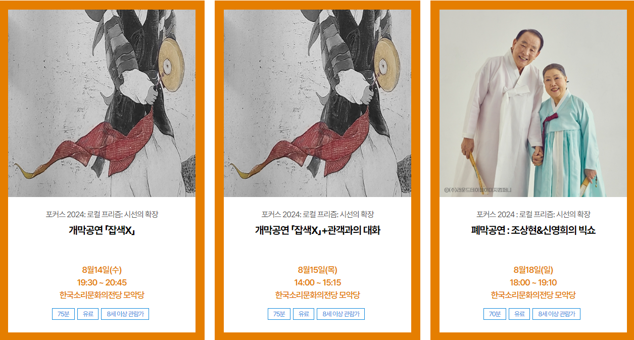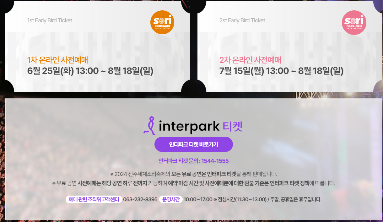 | 2024.08.14 ~ 2024.08.18 | 전북특별자치도 전주시 덕진구 소리로 31 소리문화전당 | 전북특별자치도/전주세계소리축제조직위원회 |