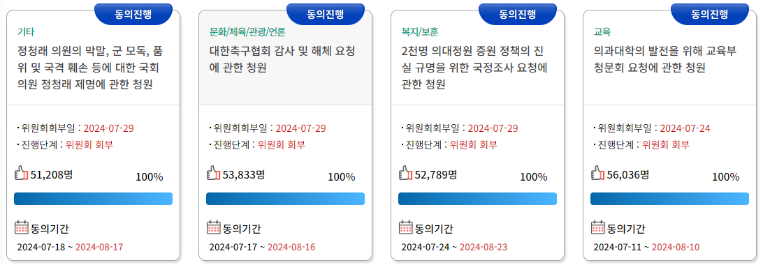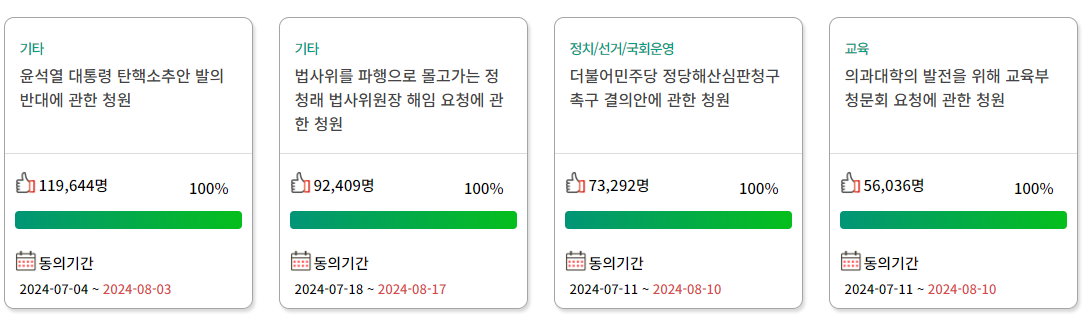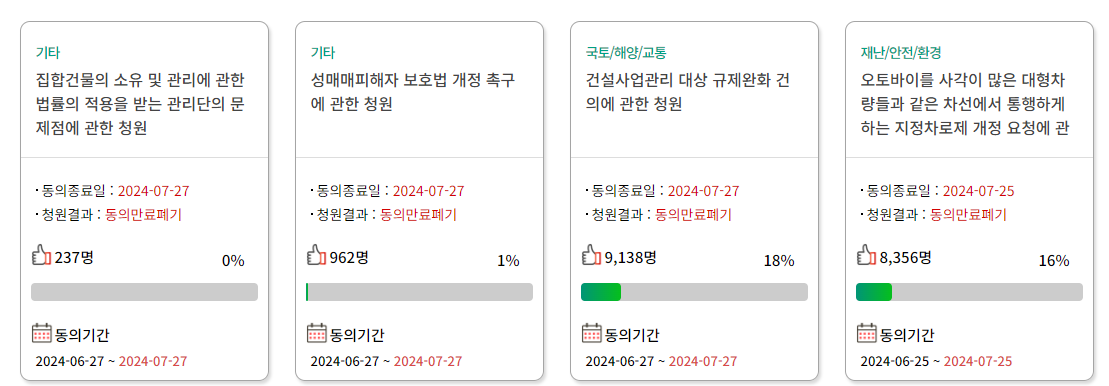 | 청원 제목 | 진행 상태 | 동의 수 |