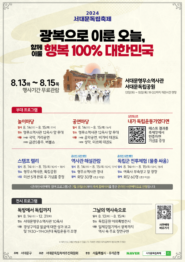 광복 제79주년을 맞아 열리는 '서대문독립축제'는 대한민국의 독립을 기념하고 축하하는 특별한 행사입니다. 이번 축제는 2024년 8월 13일부터 15일까지 3일간 서대문형무소역사관과 독립공원 일대에서 개최됩니다.