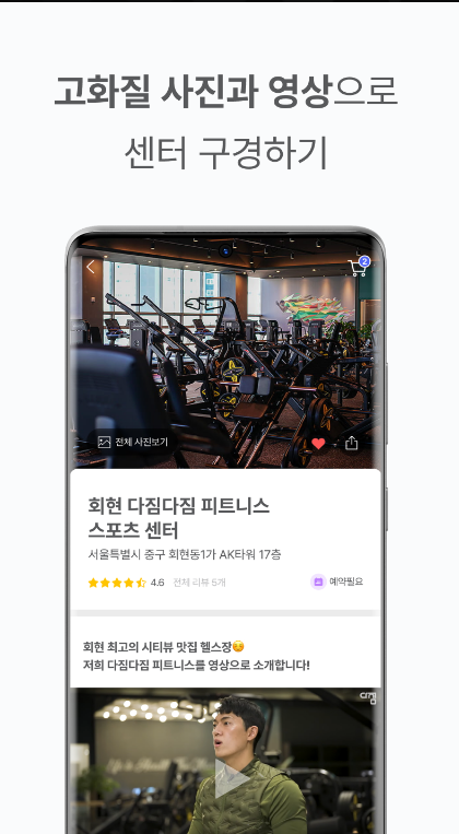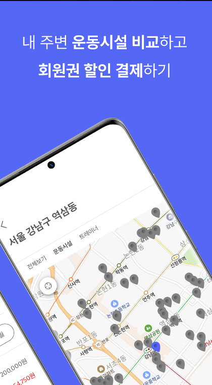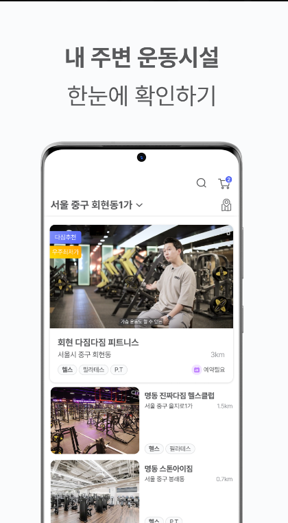 앱 설치가 완료되고 회원 가입을 마치면, 이제 헬스장, PT, 필라테스를 최저가로 검색하고 예약할 차례입니다. 앱 홈 화면에서 자신이 이용하고자 하는 서비스(헬스장, PT, 필라테스)를 선택하세요. 그러면 주변의 모든 관련 시설의 정보를 한눈에 볼 수 있습니다.