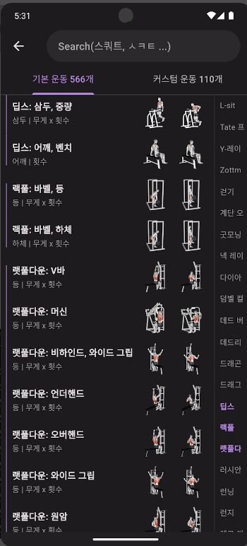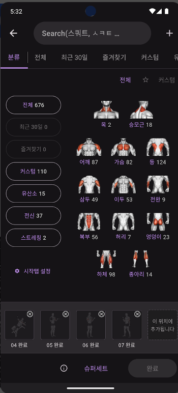 A. 모든 종류의 운동을 기록할 수 있으며, 커스텀 운동 항목을 추가하는 기능도 지원합니다.