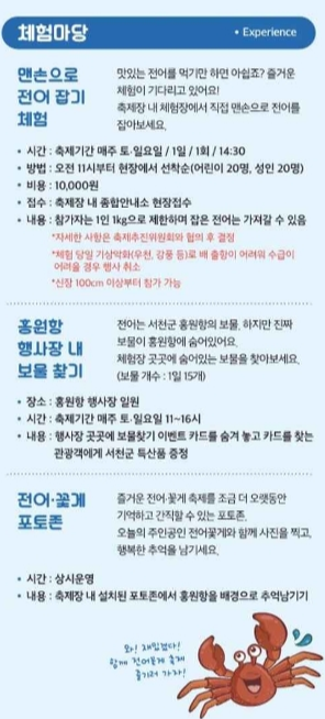 체험 프로그램은 맨손으로 전어 잡기 체험, 홍원항 행사장 내 보물 찾기, 전어 꽃게 포토존, 수산물 깜짝 경매 등 다양한 활동이 준비되어 있습니다. 현장에서 직접 체험하며 전어와 꽃게의 신선함을 느낄 수 있는 절호의 기회입니다. 또한, 홍원항 수산물 장터에서는 서천 앞바다의 신선한 해산물을 구입할 수 있으며, 다양한 지역 특산물을 직접 맛볼 수 있는 특별한 경험을 할 수 있습니다.