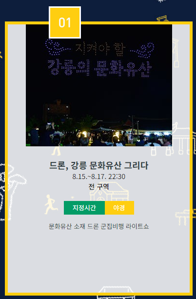 다양한 프로그램을 통해 강릉의 전통과 문화를 체험할 수 있는 기회를 제공하는 이번 야행에서는 메인 프로그램으로는 개막행사와 함께 한복 패션쇼, 드론 쇼 등이 준비되어 있습니다. 또한 강릉단오제의 '관노 가면극' 등 전통 공연이 부대 프로그램으로 마련되어 현장 분위기를 더욱 다채롭게 만들어줍니다.