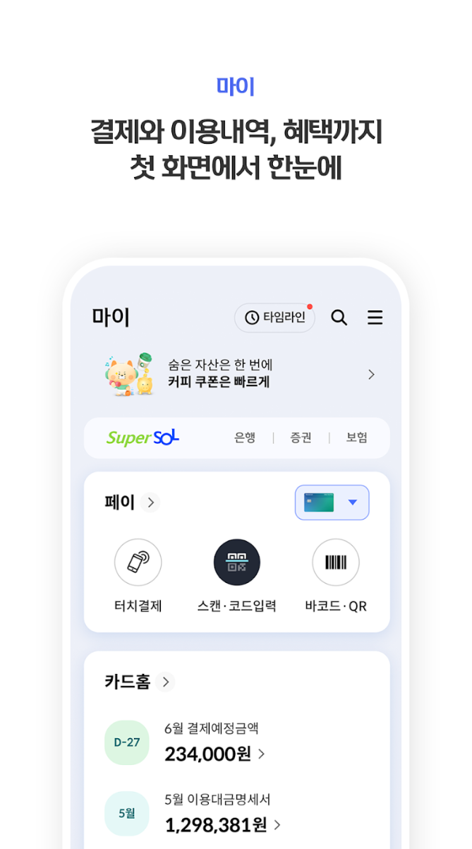 신한 SOL페이는 신한카드의 대표적인 플랫폼 앱으로, 간편하고 안전하게 결제할 수 있는 다양한 서비스를 제공합니다. 이 앱을 통해 카드 이용 내역을 실시간으로 확인하고, 포인트 적립 및 사용, 이벤트 참여 등 신한카드의 모든 기능을 한 곳에서 손쉽게 이용할 수 있습니다.