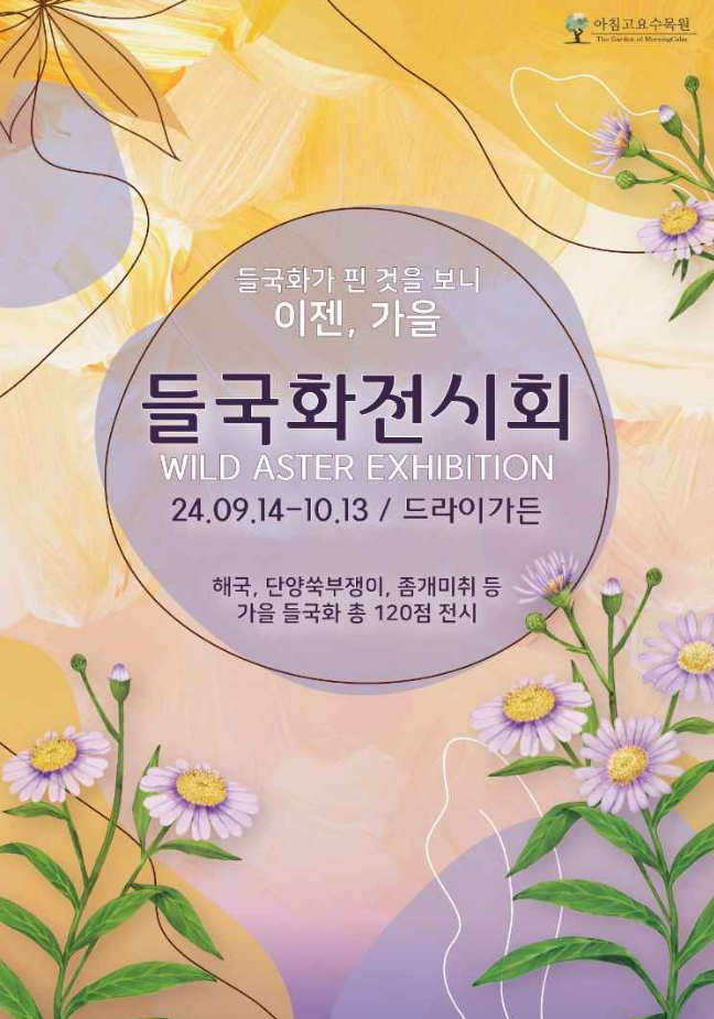 한국의 아름다운 들국화를 한자리에서 만날 수 있는 아침고요수목원의 들국화 전시회는 매년 가을, 다양한 종의 들국화를 선보이며 관람객들의 눈과 마음을 사로잡습니다. 이번 2024년 전시회는 ‘들국화가 핀 것을 보니 이젠 가을’을 주제로, 감국, 구절초, 산국 등 자생 들국화 40여 종을 소개합니다.