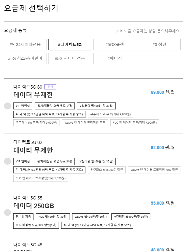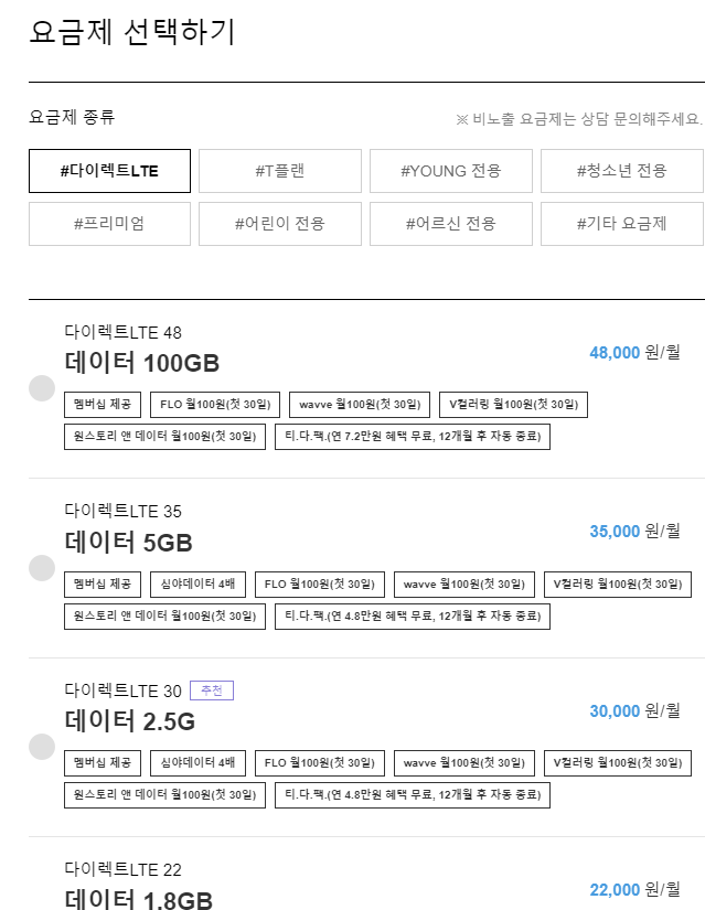 다음으로는 다이렉트LTE 요금제를 살펴보겠습니다. 이 요금제는 LTE 스마트폰만을 지원하며, T다이렉트샵에서 구매한 경우에만 가입할 수 있습니다. 총 4가지 요금제가 제공되며, 가격은 다이렉트LTE 22부터 48까지 다양하게 설정되어 있습니다.