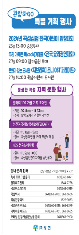 아이들에게 특별한 하루를 선물하고 싶다면 곡성심청어린이대축제를 놓치지 마세요. 다양한 공연과 체험 프로그램이 가득한 이 축제는 가족 모두에게 잊지 못할 추억을 선사합니다. 축제 기간 동안 아이들은 즐거운 시간을 보내고, 부모님들은 힐링의 시간을 가질 수 있습니다. 지금 바로 축제 일정을 확인하고 가족과 함께 특별한 추억을 만들어 보세요. 올해의 가을은 곡성에서 시작해 보세요.