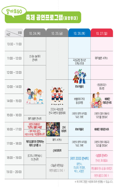 곡성심청어린이대축제에서는 인기 캐릭터 싱어롱쇼와 어린이 연극, 마술쇼 등 다양한 공연이 펼쳐집니다. 특히 축제 개막 행사로 진행되는 '디즈니 원더 곡성'은 아이들에게 잊지 못할 추억을 선사합니다. 퍼레이드와 함께 시작되는 이 행사는 10월 24일 목요일 오후 4시에 개최됩니다.