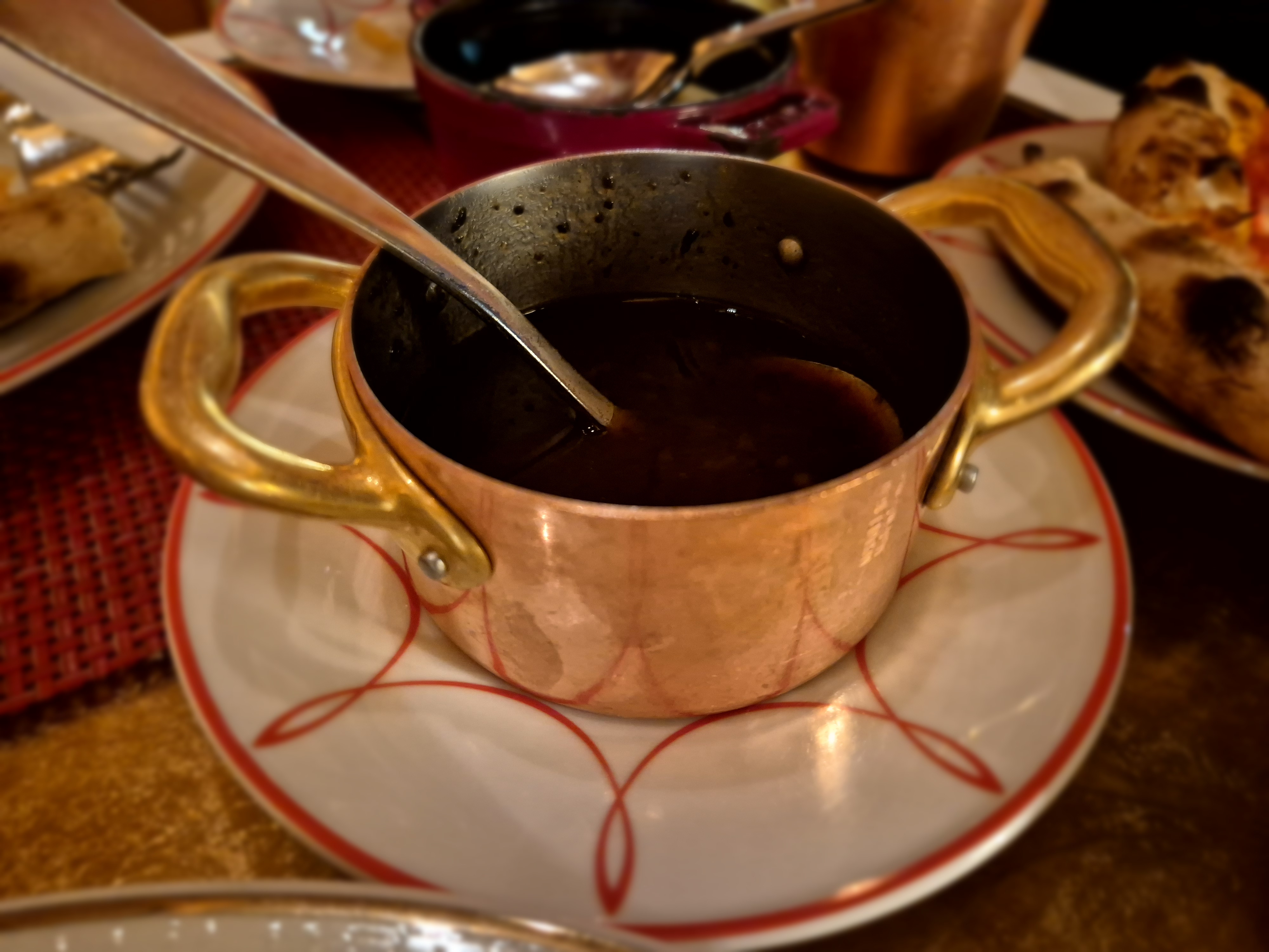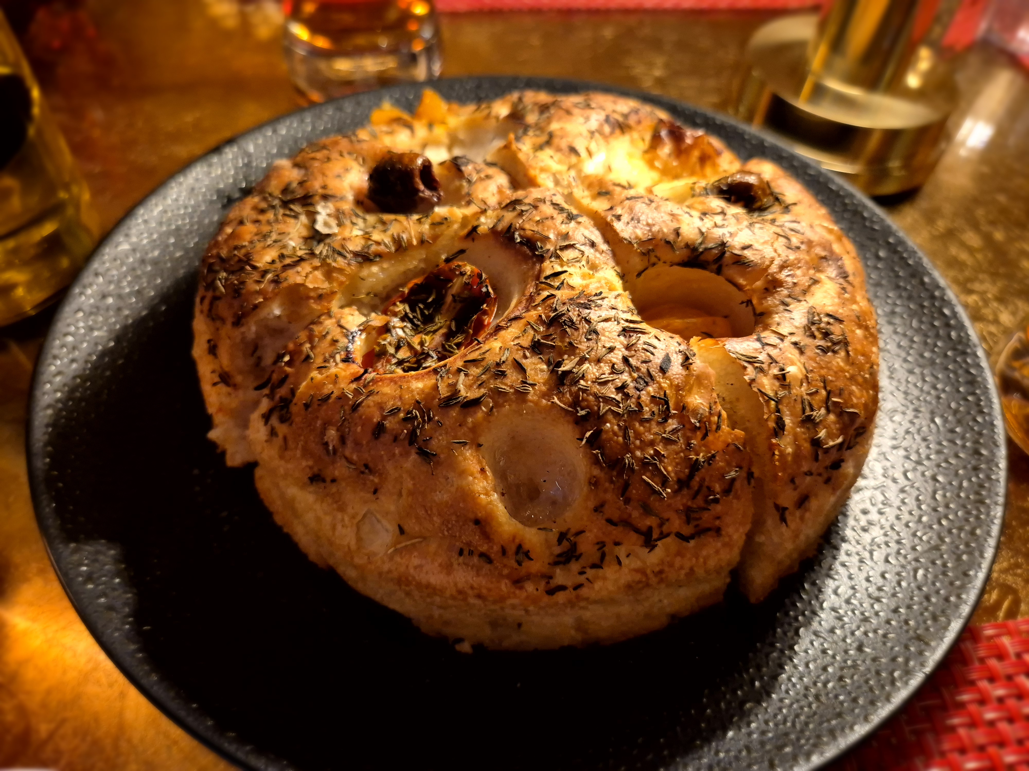 처음 에피타이저로 나오는 빵입니다. 빵 사이에 토마토를 넣어서 구운거 같은데 왜 그런건지는 잘 모르겠습니다. 그냥 빵입니다. 엄청 맛있지도 않지만 오일이랑 발사믹 소스를 희한한 통에 넣어서 주더라고요. 그게 재미있었습니다.