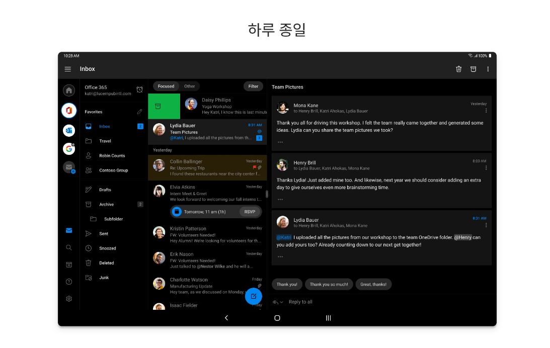 또한, 캘린더 및 연락처 동기화를 통해 일정과 연락처 관리도 편리하게 할 수 있습니다. 앱 설정에서 원하는 대로 테마 변경이나 서명 설정 등 다양한 옵션을 조정하여 사용 환경을 최적화하세요.