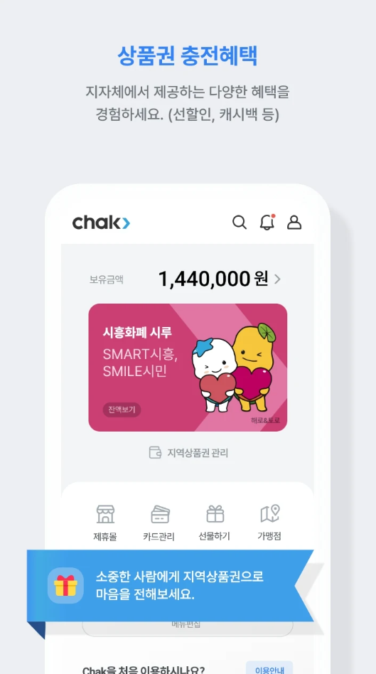지역상품권 Chak은 사용자에게 편리하고 안전한 상품권 관리 및 사용 경험을 제공합니다. 이 어플을 통해 간편하게 상품권을 구매하고, 관리하며, 다양한 혜택을 누릴 수 있습니다. 앱 설치 과정은 간단하고 직관적이어서 누구나 쉽게 이용할 수 있습니다.