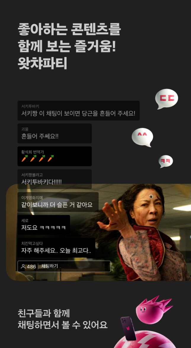 왓챠는 파티 기능을 통해 친구나 가족과 함께 영화를 시청하며 실시간 채팅을 즐길 수 있습니다. 멀리 떨어져 있는 사람들과도 동시 시청이 가능하여, 함께 영화를 보며 의견을 나누고 감상을 공유할 수 있습니다. 이 기능은 특히 사회적 거리두기가 필요한 시기나 멀리 있는 지인들과의 소통에 큰 도움이 됩니다. 파티기능으로 더욱 즐거운 시청 경험을 만드세요.
