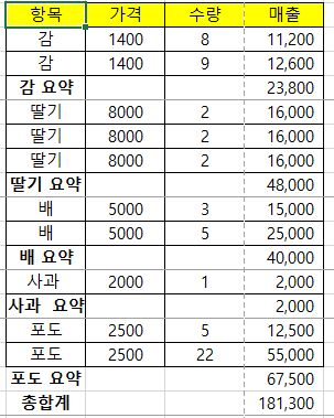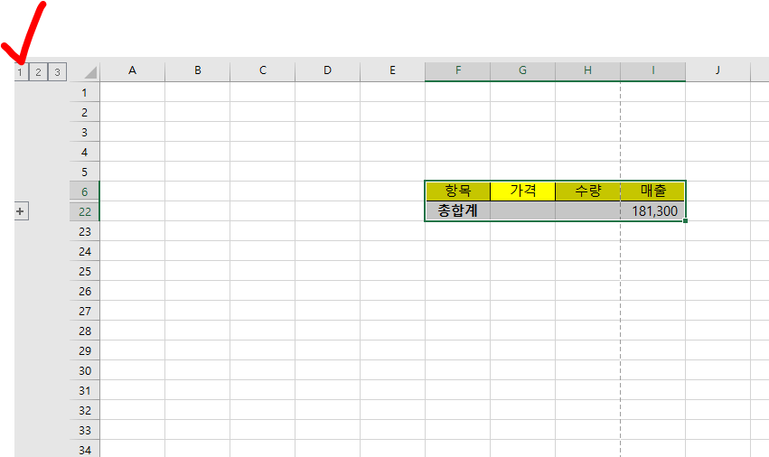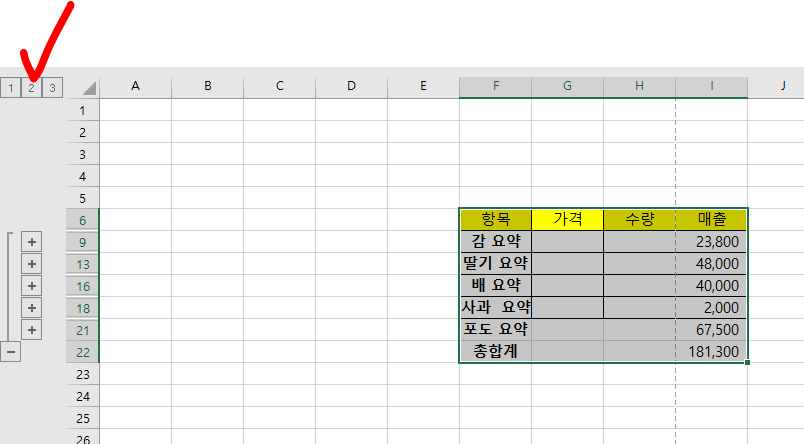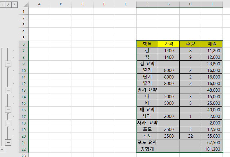 - 윤곽 단추 사용: 시트의 왼쪽에 표시된 숫자 단추를 클릭하여 데이터를 접거나 펼칠 수 있습니다. 이를 통해 전체 합계부터 각 그룹의 세부 데이터까지 다양한 수준에서 데이터를 확인할 수 있습니다.