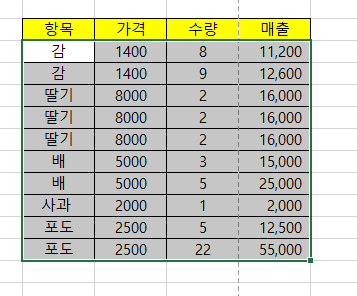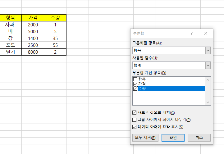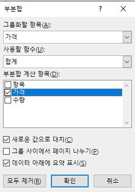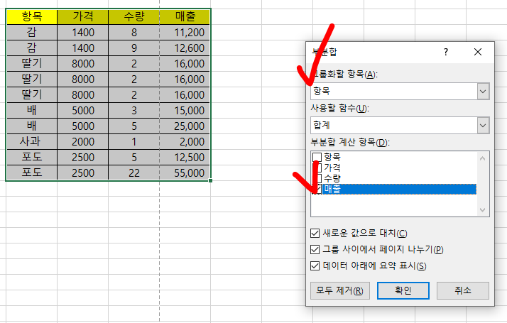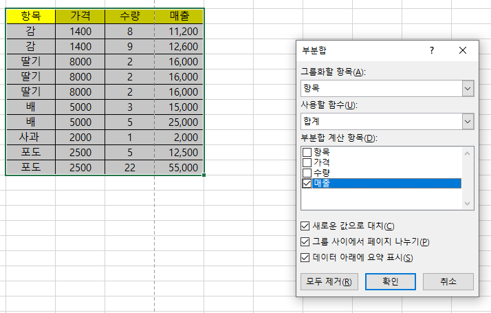 - 항목 선택: 실제로 계산할 열을 선택합니다. 예를 들어, '매출' 열을 선택하면 부서별 매출 합계가 계산됩니다.