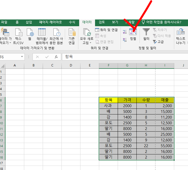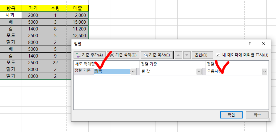 - 그룹화 기준 선택: 데이터를 그룹화할 기준 열을 선택합니다. 예를 들어, 부서별로 항목을 구하려면 '항목' 열을 선택합니다.