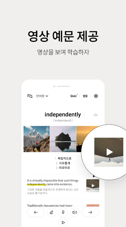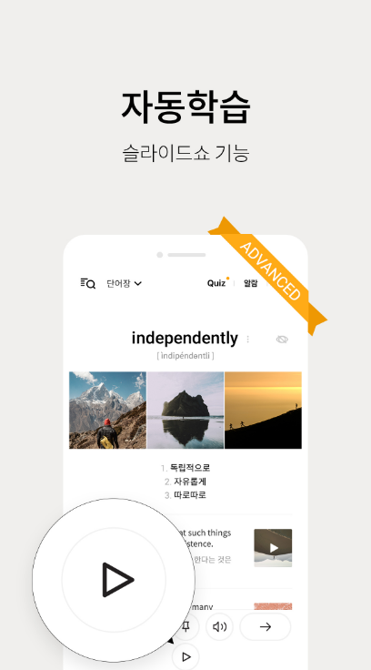 예문 제공 기능은 현지인이 작성한 유용한 예문을 통해 단어의 실제 사용법을 익힐 수 있도록 도와줍니다. 나만의 단어장을 구성하여 자주 틀리는 단어를 별도로 관리할 수 있으며, 암기한 단어는 숨기기 기능을 통해 학습 목록에서 제외할 수 있습니다. 또한, 자동 학습 기능으로 슬라이드 쇼를 통해 단어를 반복적으로 학습할 수 있습니다.