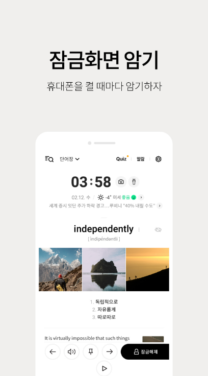 잠금화면에서 단어를 지속적으로 보여줌으로써 학습자의 노출 빈도를 높입니다. 사용자가 휴대폰을 켤 때마다 새로운 단어가 나타나므로, 짧은 시간 동안 자주 반복 학습할 수 있습니다. 이러한 방식은 단어 암기를 자연스럽고 지속적으로 이루어지게 하여, 장기적인 기억 형성에 큰 도움을 줍니다.