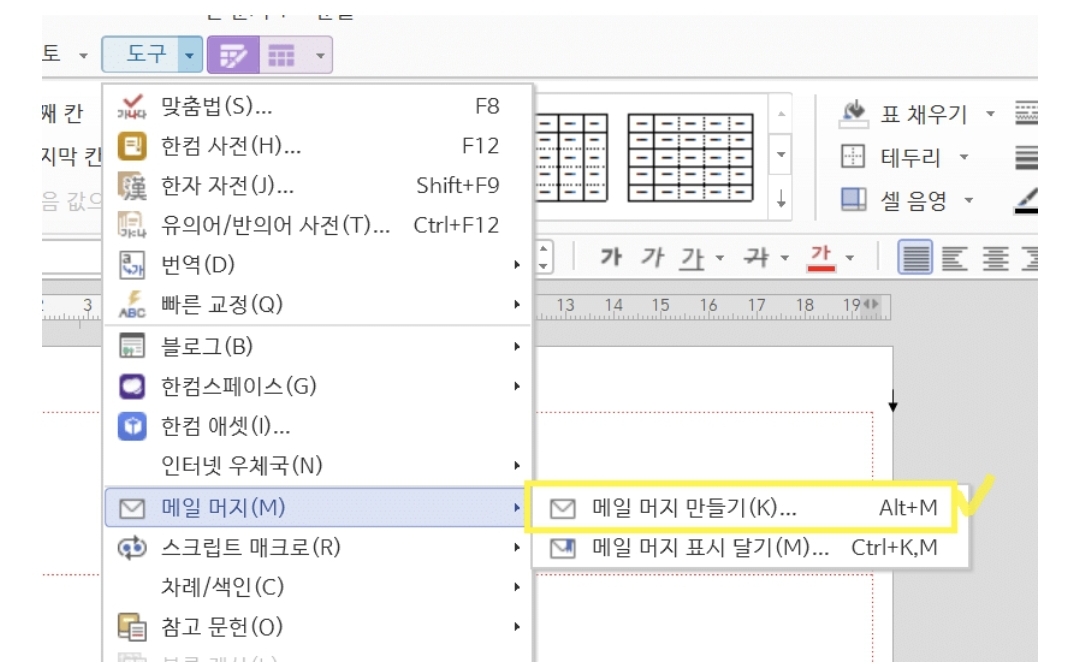 작업을 시작하기 전에, 메일 머지 기능을 활성화합니다. 상단 메뉴에서 도구 > 메일 머지 > 메일 머지 표시 달기를 선택하거나, 단축키 Ctrl + K, M을 사용합니다. 메일 머지를 통해 엑셀 데이터와 라벨 문서를 효율적으로 연동할 수 있습니다. 이는 대량의 주소를 빠르게 적용하는 데 필수적입니다.