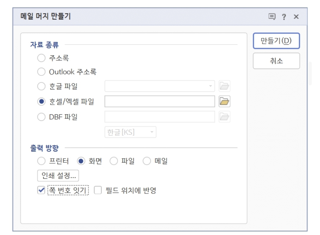 모든 설정이 완료되면, 메일 머지 기능을 사용하여 주소록 데이터를 문서에 적용합니다. 상단 메뉴에서 도구 > 메일 머지 > 메일 머지 만들기를 선택하거나, 단축키 Alt + M을 사용합니다. 파일을 선택할 때, 파일이 열려 있지 않은지 확인해야 합니다. 파일이 열려 있으면 오류가 발생할 수 있으므로, 반드시 닫은 상태에서 작업을 진행하세요. 출력 방향을 '화면으로' 설정하면 미리보기를 통해 최종 확인이 가능합니다.
