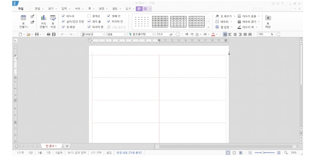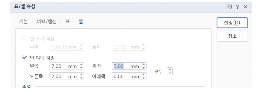 문서가 생성되면 F5 키를 세 번 눌러 전체 선택을 합니다. 전체 선택된 상태에서 P 키를 눌러 표 또는 셀의 속성을 열고, 원하는 여백 값을 입력합니다. 여백을 조정하면 배치가 더욱 정확해집니다. 작업 전에 여백을 정확히 설정해두면 출력 시 문제가 발생하지 않습니다.
