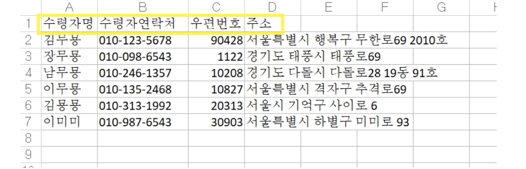 A. 엑셀 파일은 각 주소 항목이 행으로 구성되어야 하며, 첫 번째 행에는 이름, 주소, 전화번호 등 필요한 필드명을 입력해야 합니다. 필드명이 라벨 문서와 정확히 일치하도록 작성하는 것이 중요합니다.