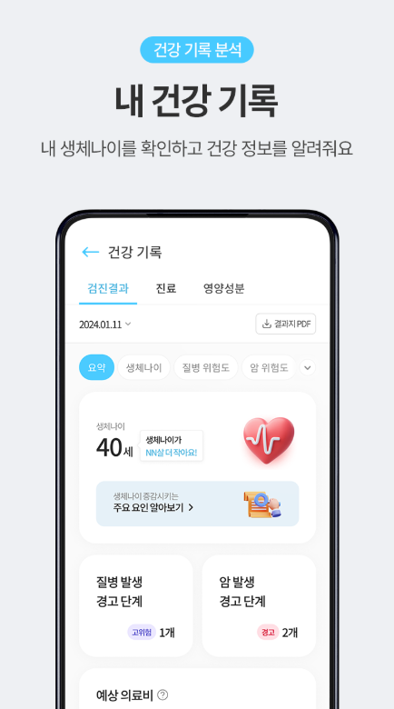 이와 같은 체계적인 분석은 고객이 자신의 건강과 보험 가입 상태를 동시에 개선할 수 있는 기반을 마련하며, 보험 상품 선택 시 과학적인 데이터를 토대로 합리적인 결정을 내릴 수 있도록 도와줍니다. 또한 정기적인 건강 검진 기록 업데이트와 전문가 상담을 통해 보험과 건강 관리의 시너지 효과를 극대화하며, 고객 맞춤형 서비스를 지속적으로 발전시켜 나가고 있습니다. 고객은 이러한 통합 서비스를 통해 보다 나은 건강과 보장을 동시에 누릴 수 있습니다.