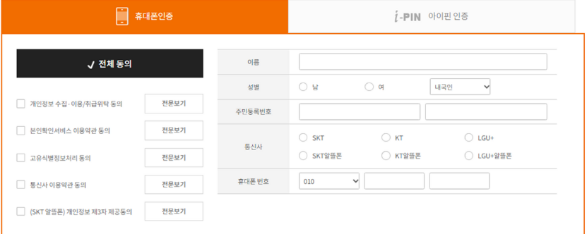 가입과정은 먼저 개인 인증과 자동차 정보를 입력하는 단계로 나뉩니다. 개인인증은 휴대폰 번호로 간단히 할 수 있고, 차량 정보는 차량을 새로 구입한 경우 직접 입력하거나, 기존의 계약 정보를 불러올 수 있습니다.
