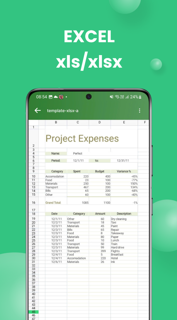 A. 이 앱은 PDF, Word(DOCX), Excel(XLSX), PPTX 형식을 지원합니다. 다양한 문서를 하나의 앱에서 관리하고 열어볼 수 있습니다.