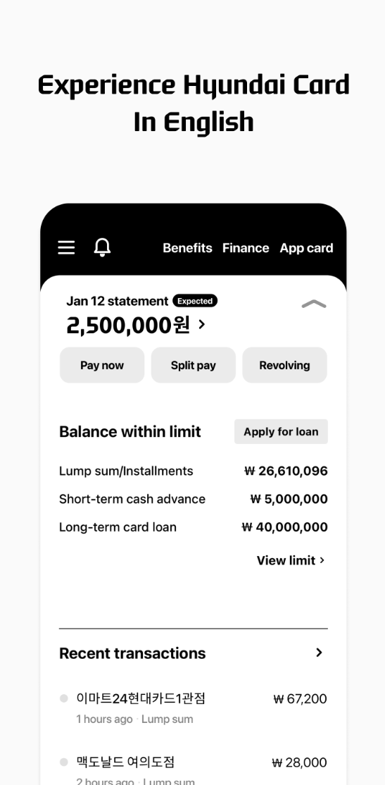 카드 결제와 관리가 한눈에 가능한 현대카드 앱은, 이번 달 결제 금액과 최근 카드 이용내역을 바로 확인할 수 있습니다. 또한, 24시간 언제든지 간편하게 카드 발급을 받을 수 있어 매우 편리합니다.