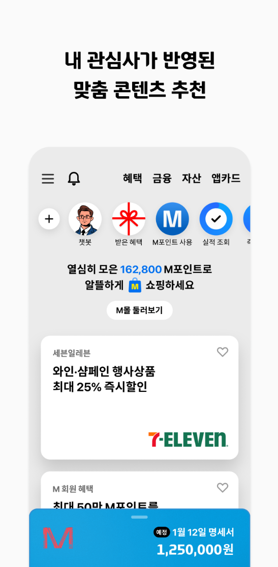 현대카드 앱은 사용자의 소비 패턴을 분석하여 카드 혜택과 쇼핑 상품을 추천해줍니다. 이렇게 나의 관심사를 반영한 맞춤 콘텐츠로 더욱 스마트한 소비가 가능합니다.
