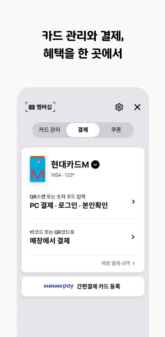 현대카드 앱은 매장 결제 시 사용할 수 있는 맞춤 쿠폰과 혜택을 제공합니다. 이렇게 빠르게 카드 정보를 확인하고, 즉시 결제를 처리할 수 있어 매우 유용합니다.