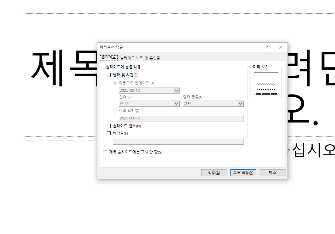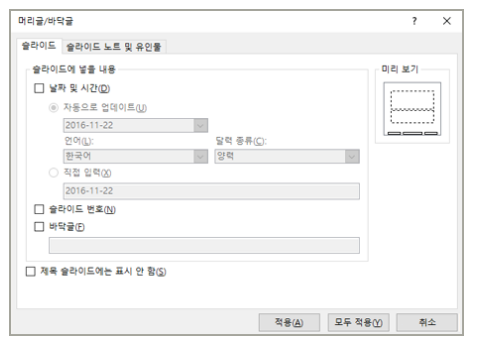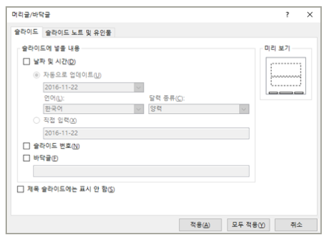 - "슬라이드 번호" 또는 "머리글/바닥글"을 선택합니다.