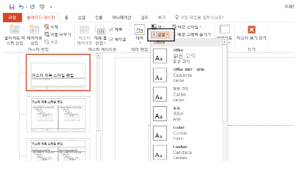 - "슬라이드 마스터" 탭의 "배경" 그룹에서 "글꼴"을 클릭하고 원하는 것을 선택합니다.